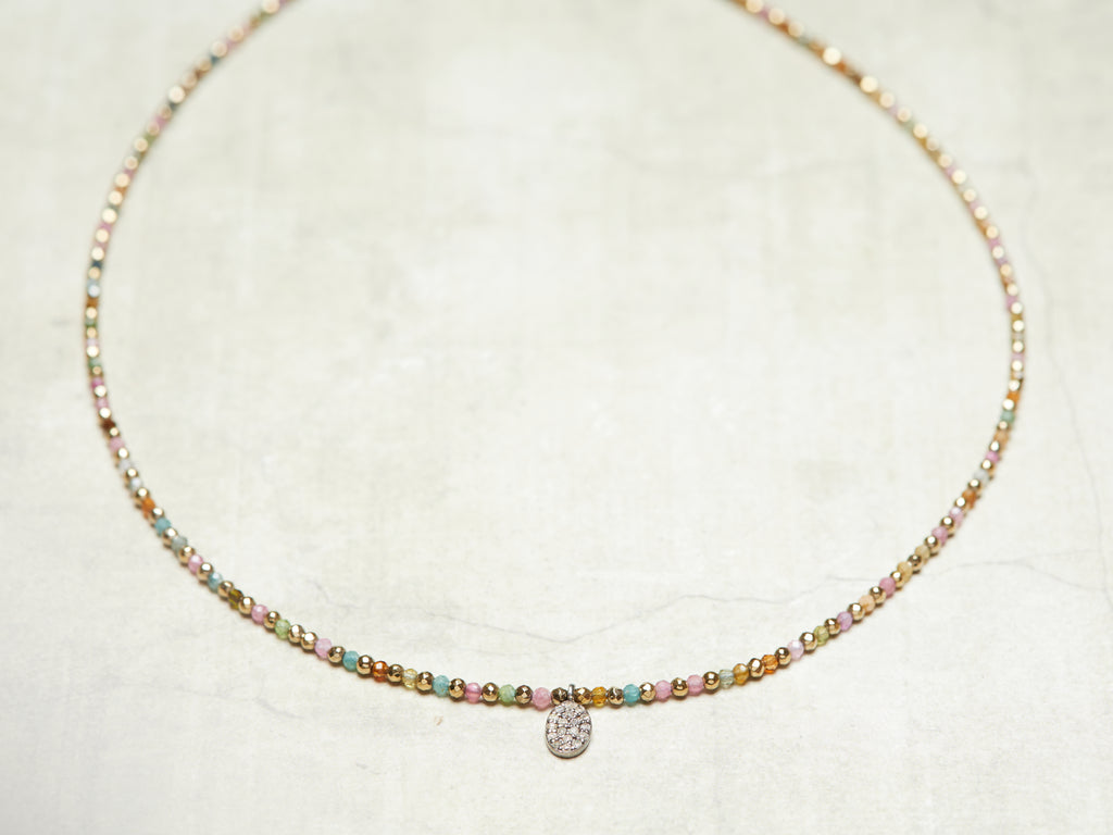 Minnie $325.00 Default Title Quantity Add to Cart This item is a recurring or deferred purchase. By continuing, I agree to the cancellation policy and authorize you to charge my payment method at the prices, frequency and dates listed on this page until my order is fulfilled or I cancel, if permitted. This product is currently sold out. Please fill in the form below if you'd like to be notified when it becomes available. Your Email Delicate 3mm gold tone pyrite with tourmaline and center silver oval pavé diamond 16" -40cm