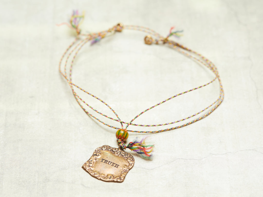 The Veritas bronze amulet on rainbow braided cord with a vintage Venetian African style glass chevron.
