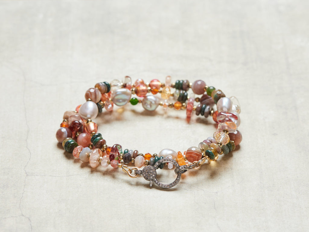 Agate, lepidolite, citrine, sweet water pearls, gold tone pyrite paired with our large sterling silver pavé diamond Pili clasp. Charm not included.