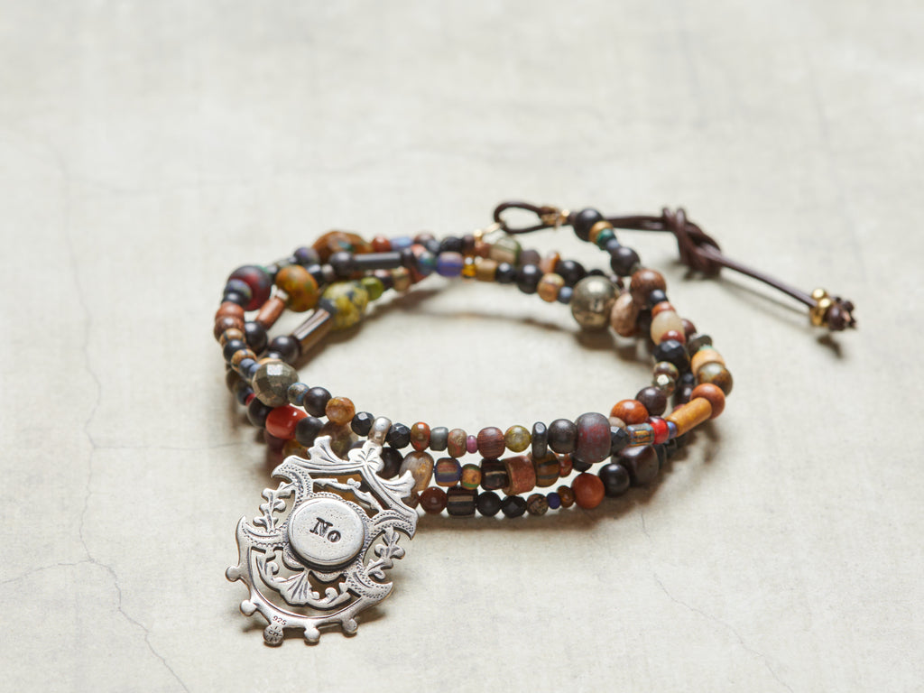 Our beloved "Yes, No" Avalon pendant can be switched from front to back depending on the mood of the moment. We paired it here with a feminine blend of ebony, agate, turquoise, vintage African beads and Japanese ceramic beads. Each is unique.