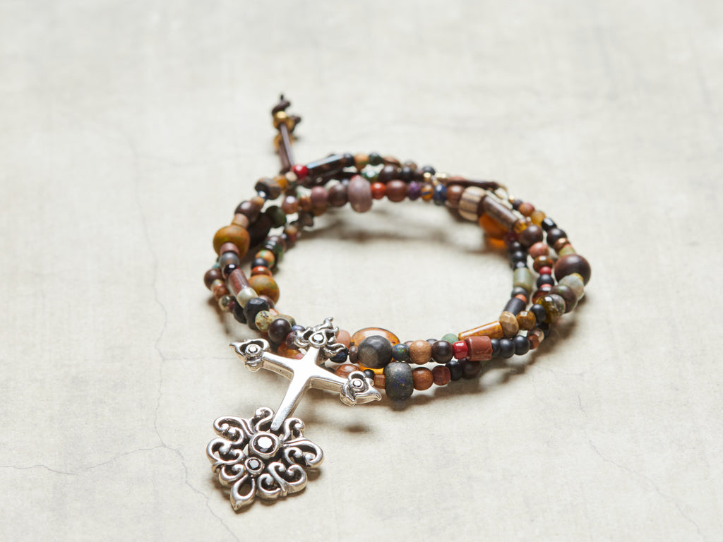 Our "Croix Sacrée" (Sacred Cross) in sterling silver and black diamond presented on ebony, assorted agate and vintage African beads.