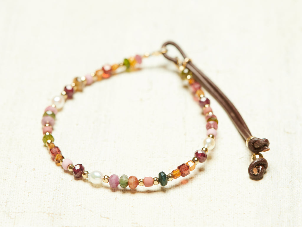 Center akoya pearl with garnet, tourmaline, Japanese ceramic, agate and gold tone pyrite.